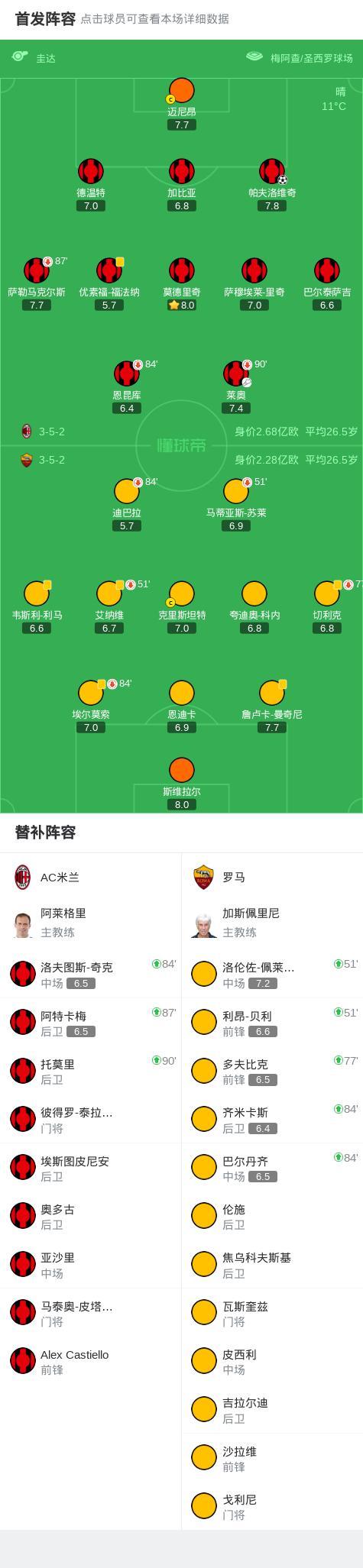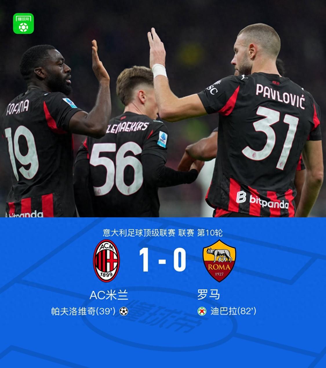 北京時間11月3日意大利足球頂級聯賽 聯賽 第10輪,AC米蘭主場對陣羅馬。上半場,萊奧助攻帕夫洛維奇破門,打破場上平衡。福法納錯失擴大比分的機會。下半場,莫德里奇角球開出,恩昆庫撞射擊中立柱。恩昆庫手球送點,迪巴拉主罰點球被邁尼昂撲出。最終,AC米蘭主場1-0小勝羅馬。