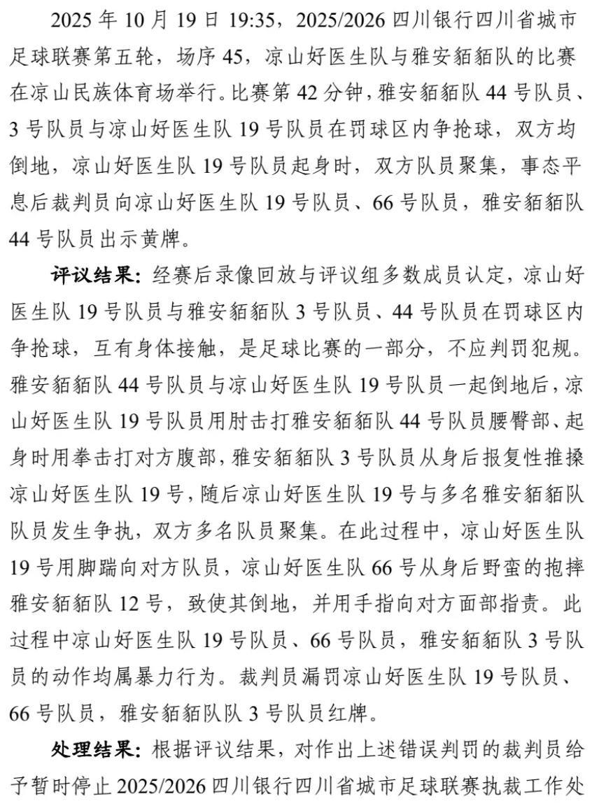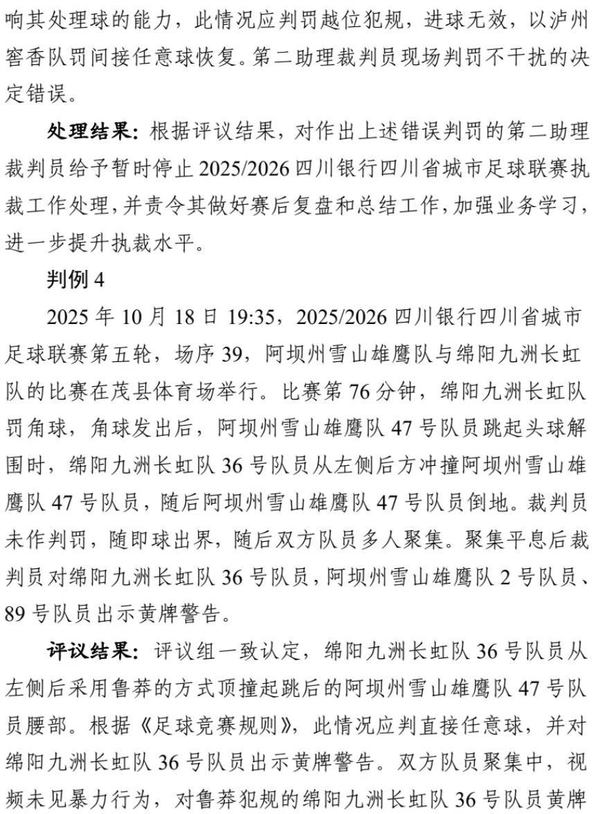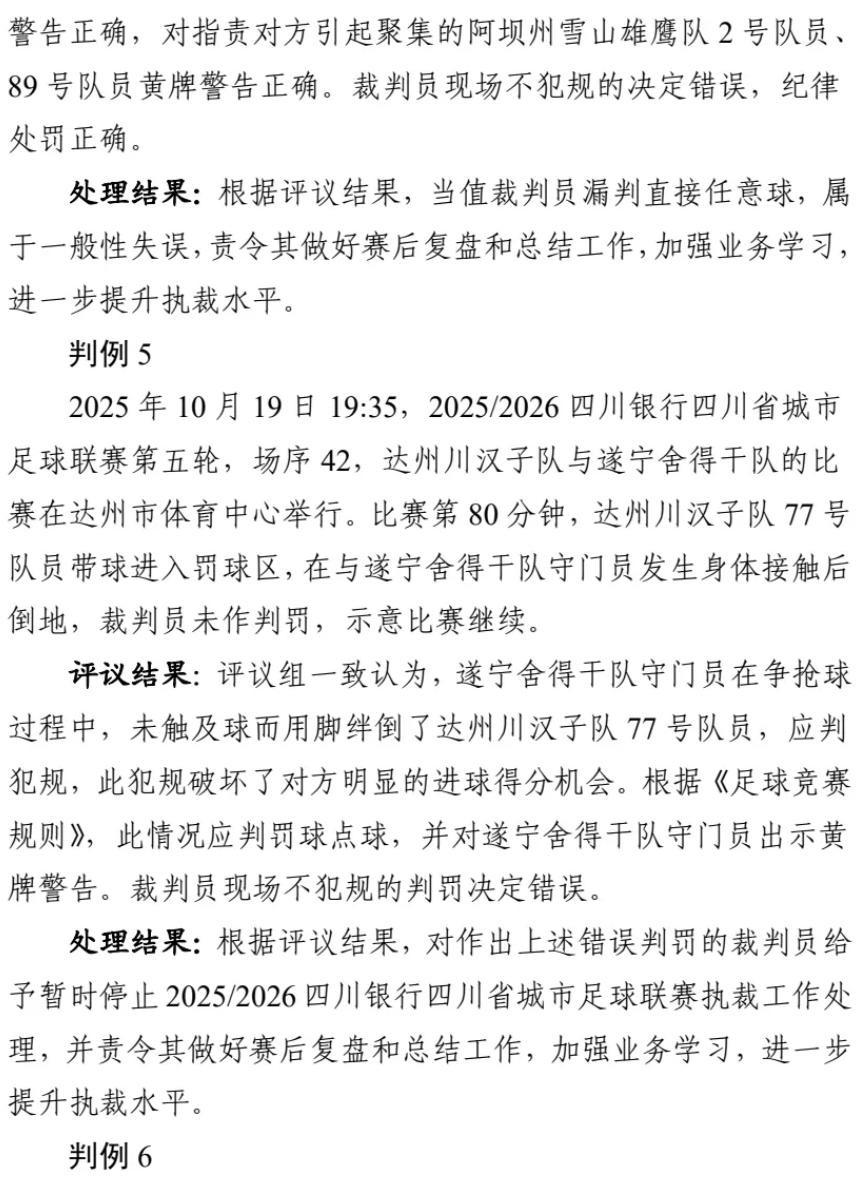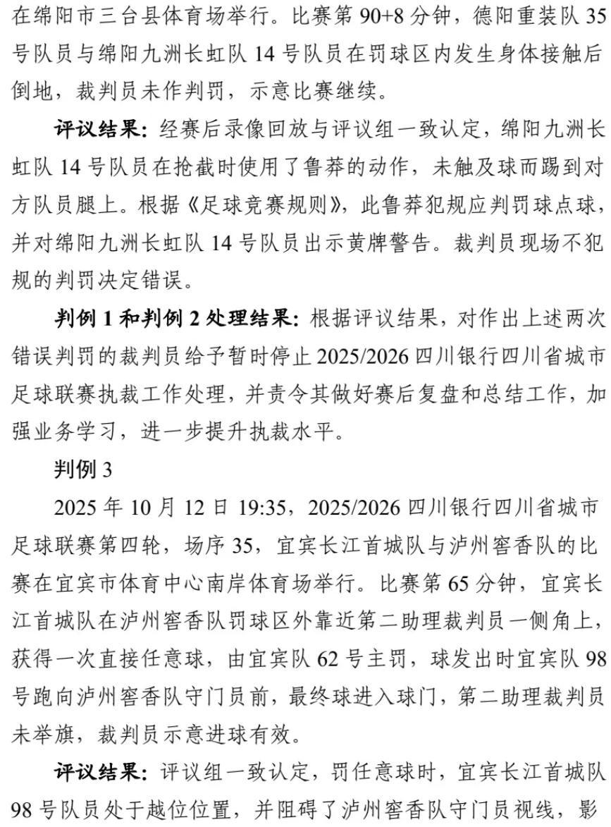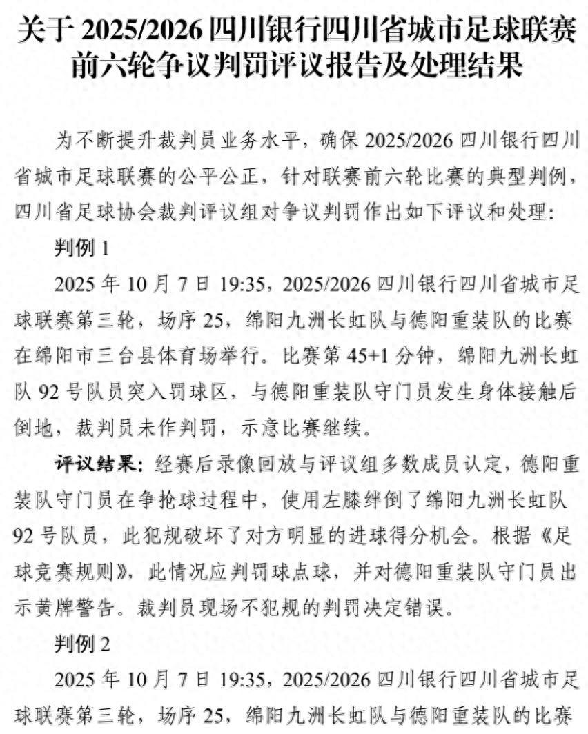 近日,四川省城市足球聯賽(川超)組委會公佈了前六輪爭議判罰評議報告及處理結果。