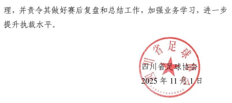 川超聯賽公佈多起爭議判罰評議結果,多位裁判被停哨