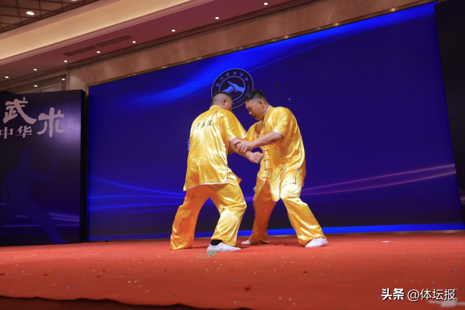 換屆大會後,溫州南拳協會新當選的主席、副主席和特邀副主席逐個上臺展演剛柔拳、虎鶴拳、五基拳、扣步羅漢拳、丈二棒等40多個南拳套路,挺宇集團武術隊展演集體羅漢排打功,把本次展演活動推向高潮。