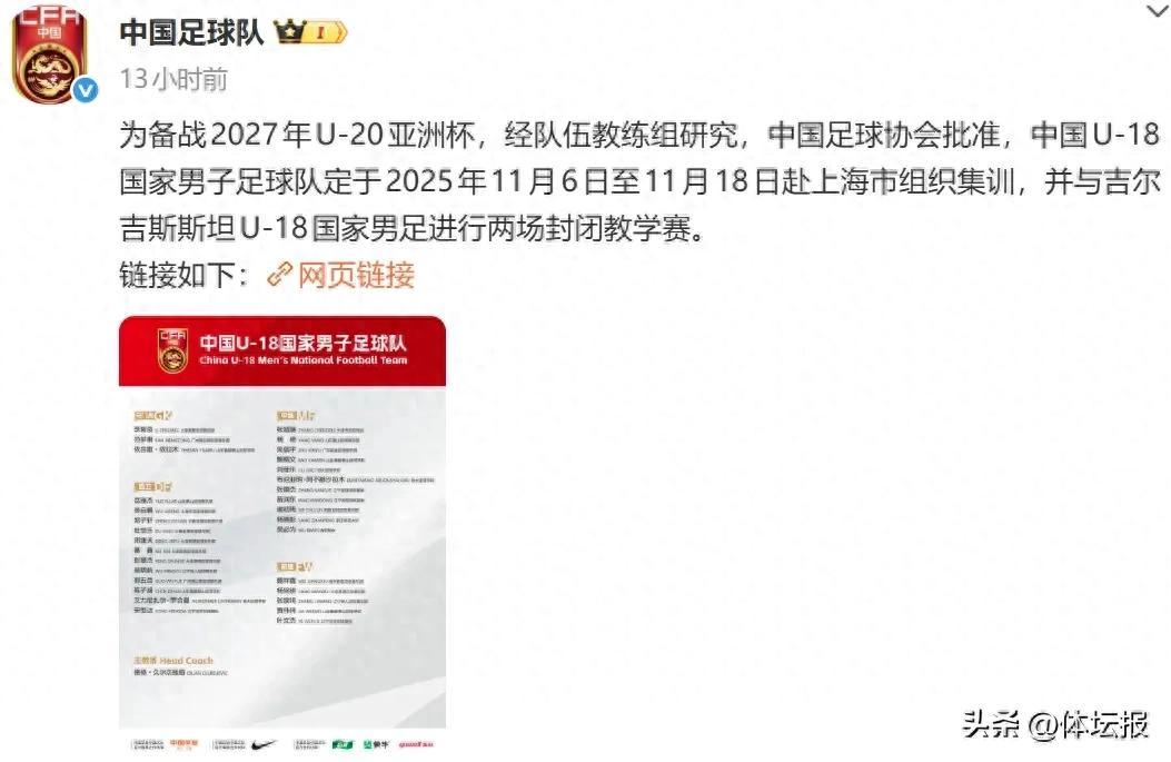 國足官方發文:爲備戰2027年U-20亞洲盃,經隊伍教練組研究,中國足球協會批准,中國U-18國家男子足球隊定於2025年11月6日至11月18日赴上海市組織集訓,並與吉爾吉斯斯坦U-18國家男足進行兩場封閉教學賽。
