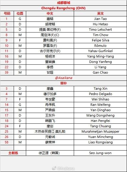 成都客戰首爾:成都全主力出戰,林加德首發,韋世豪替補