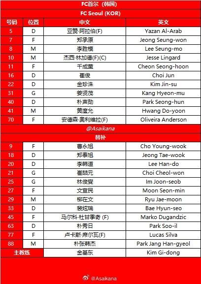 首爾首發:31-姜賢茂、16-崔浚、5-亞贊-阿拉伯、40-樸聲勳、22-金珍洙、8-李勝模、10-林加德、41-黃度允、7-鄭承原、11-千成薰、70-奧利維拉