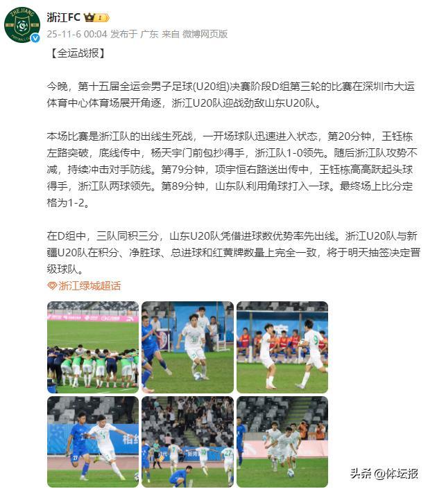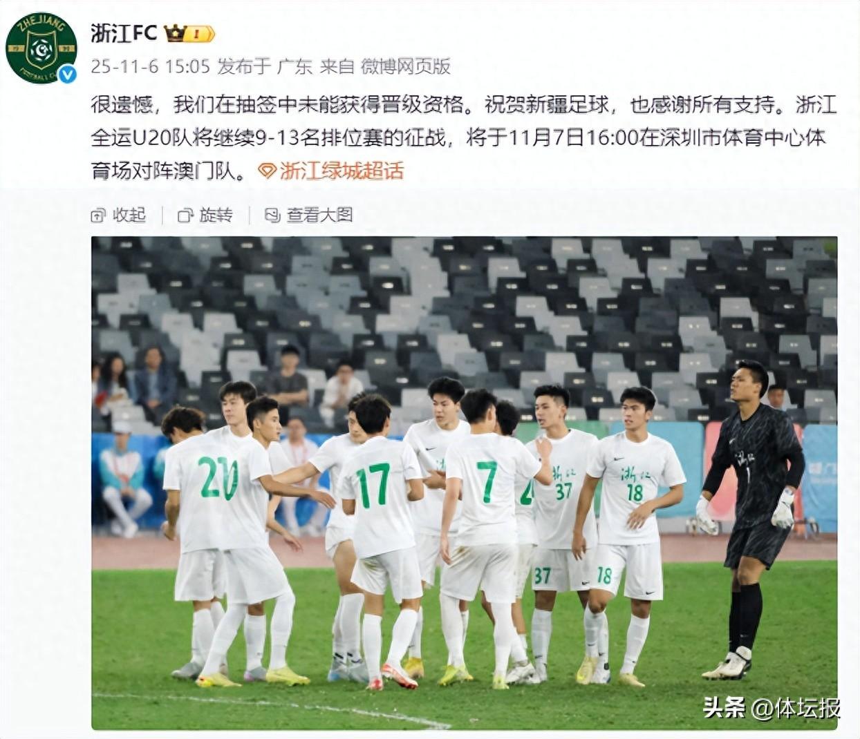11月6日,全運會U20男足D組的晉級懸念揭曉,根據抽籤結果浙江隊遺憾未能獲得晉級資格。