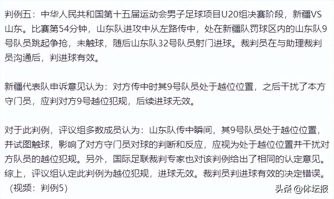 對於此判例,評議組多數成員認爲:山東隊傳中瞬間,其9號隊員處於越位位置,並試圖觸球,影響了對方守門員對球的判斷和反應,應視爲處於越位位置並干擾對方隊員的越位犯規。另外,國際足聯裁判專家也對該判例給出了相同的認定意見。綜上,評議組認定此判例爲越位犯規,進球無效。裁判員判進球有效的決定錯誤。