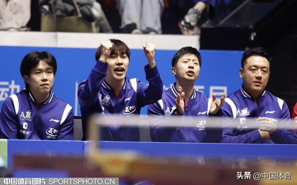 北京隊王楚欽(左一)、馬龍(右二)爲場上隊友加油