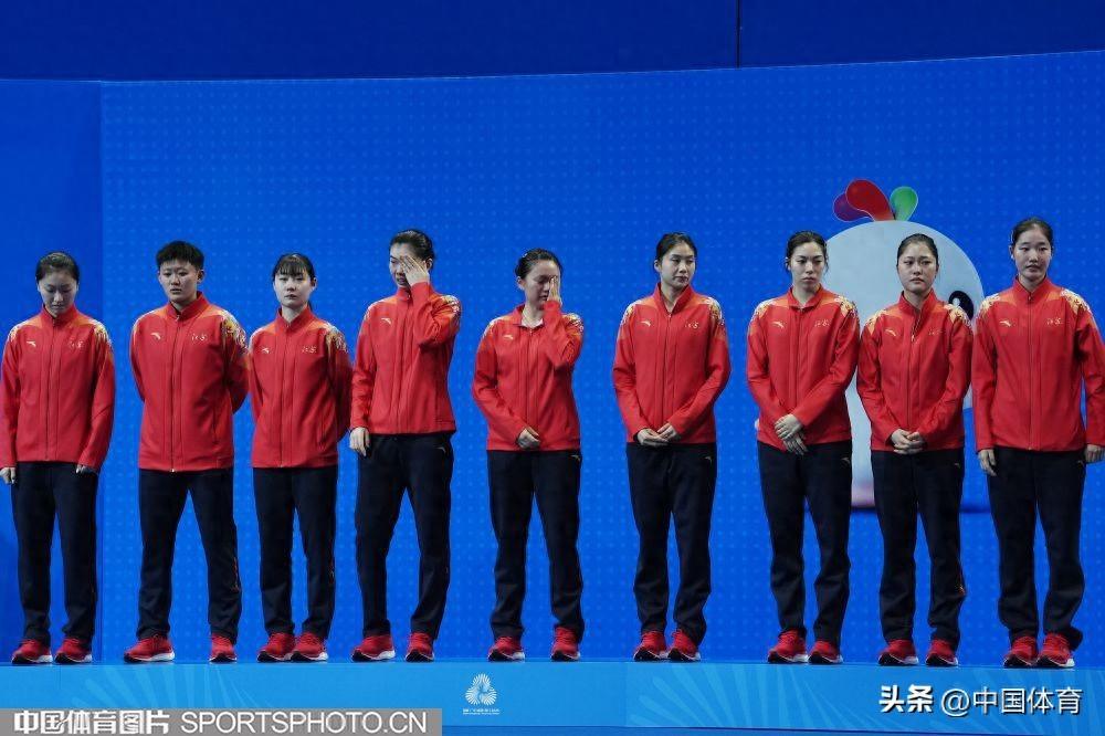 中國體育訊 11月14日,第十五屆全運會羽毛球項目女子團體決賽在深圳體育中心體育館進行,江蘇隊0比3不敵浙江隊,無緣金牌。頒獎臺上,江蘇選手紛紛落淚。圖爲江蘇隊在頒獎臺上。(中國體育圖片 倪敏哲 攝)
