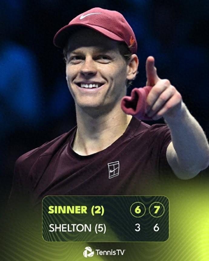 11月14日,ATP年終總決賽比約-博格組,衛冕冠軍辛納2-0(6-3、7-6(3))戰勝5號種子謝爾頓,豪取室內硬地29連勝,小組賽不失一盤鎖定小組第一,半決賽將戰德米納爾。