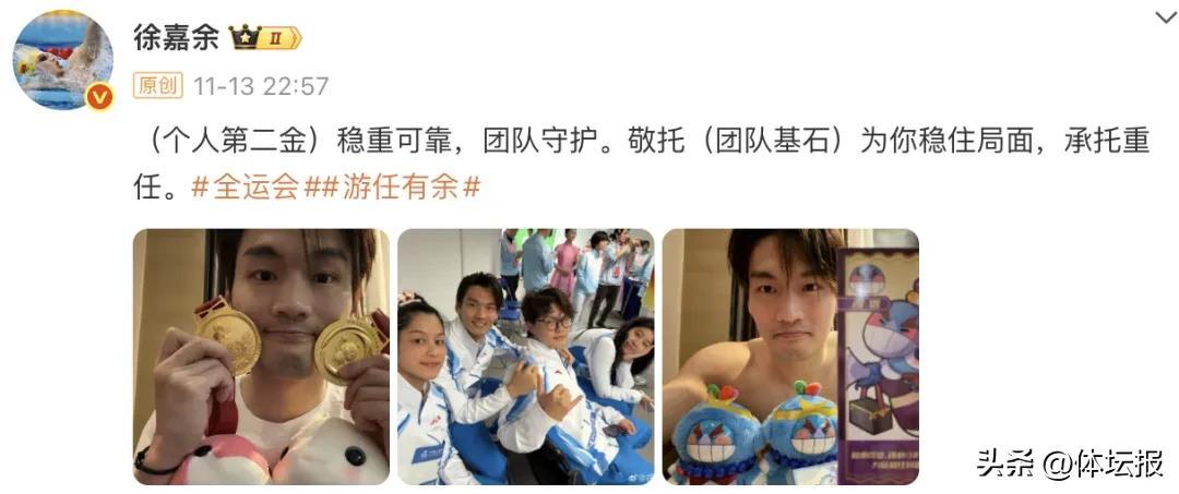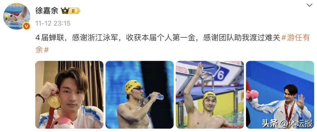 4屆全運會,16枚金牌,這名30歲的仰泳老將在全運賽場獨孤求敗,而他的身後仍是一片空檔,他仍然在扛着中國仰泳奮力前行。第一天比賽時,徐嘉餘說:“目標沒什麼變化,就是過來拿金牌的。”而他也用四枚金牌兌現了自己的承諾。