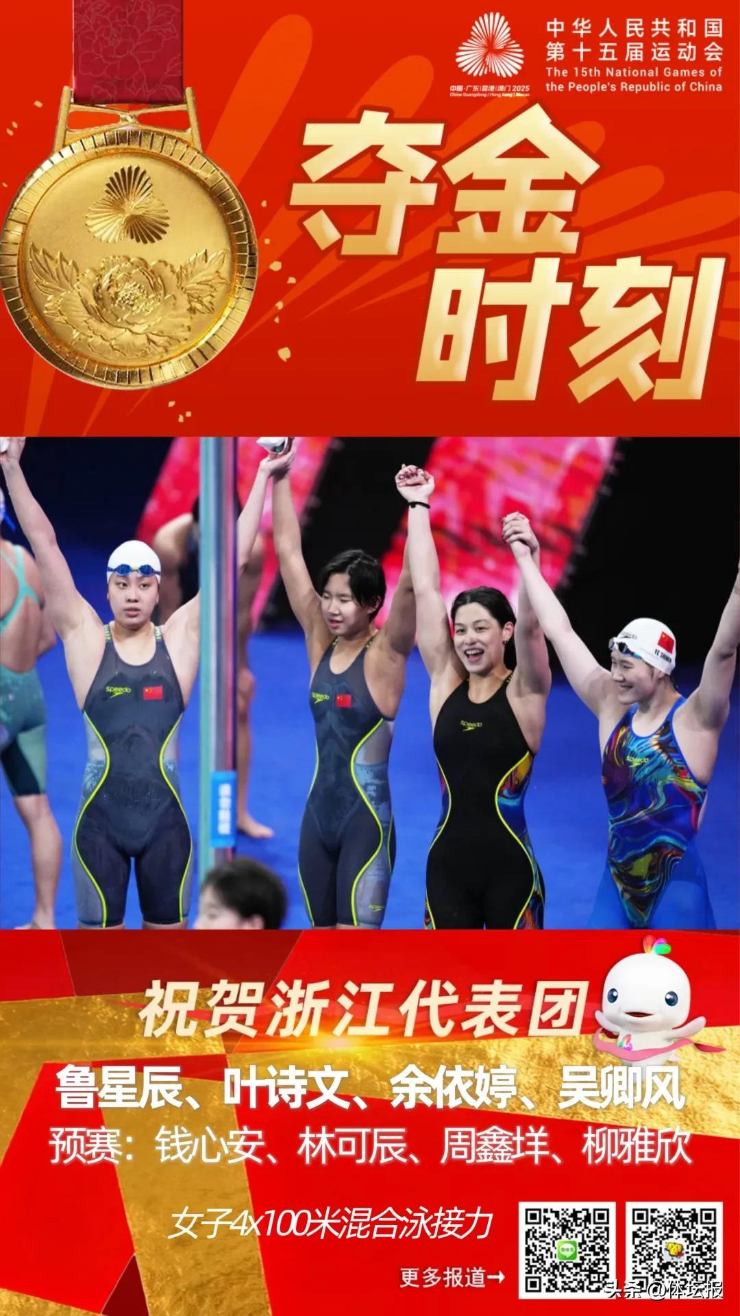 女子4×100米混合泳接力中,浙江隊派出了和預賽(錢心安、林可辰、周鑫垟、柳雅欣)完全不一樣的陣容,由魯星辰、葉詩文、餘依婷和吳卿風出戰。其中小將魯星辰在此前100米個人仰泳的項目上收穫了一枚銀牌,在開棒中一馬當先,以第一名到邊將接力棒交到了奧運冠軍葉詩文的手中。隨後,浙江與上海隊在2、3棒展開了激烈爭奪。最終,浙江隊四人攜手以3分57秒97收穫了最後一枚金牌。