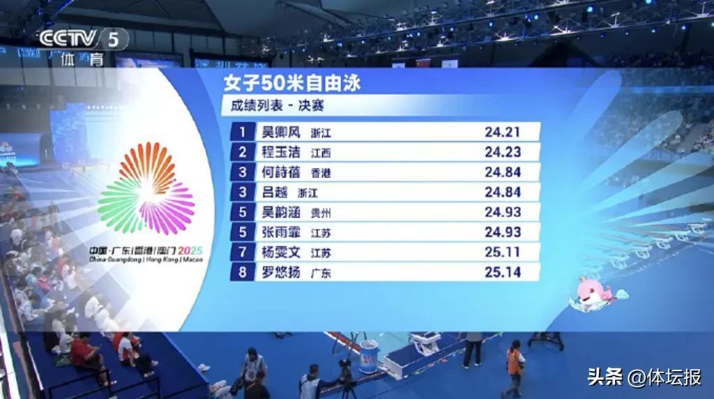 女子50米自由泳的飛魚大戰中,8位選手展開了毫秒級的競爭。浙江選手吳卿風憑藉極致爆發力與完美衝刺,以24秒21的驚人成績強勢奪金,領先第二名的程玉潔0.02秒。香港隊名將何詩蓓與浙江選手呂越同以24秒24並列季軍,同時值得一提的是,呂越刷新了個人最好成績。