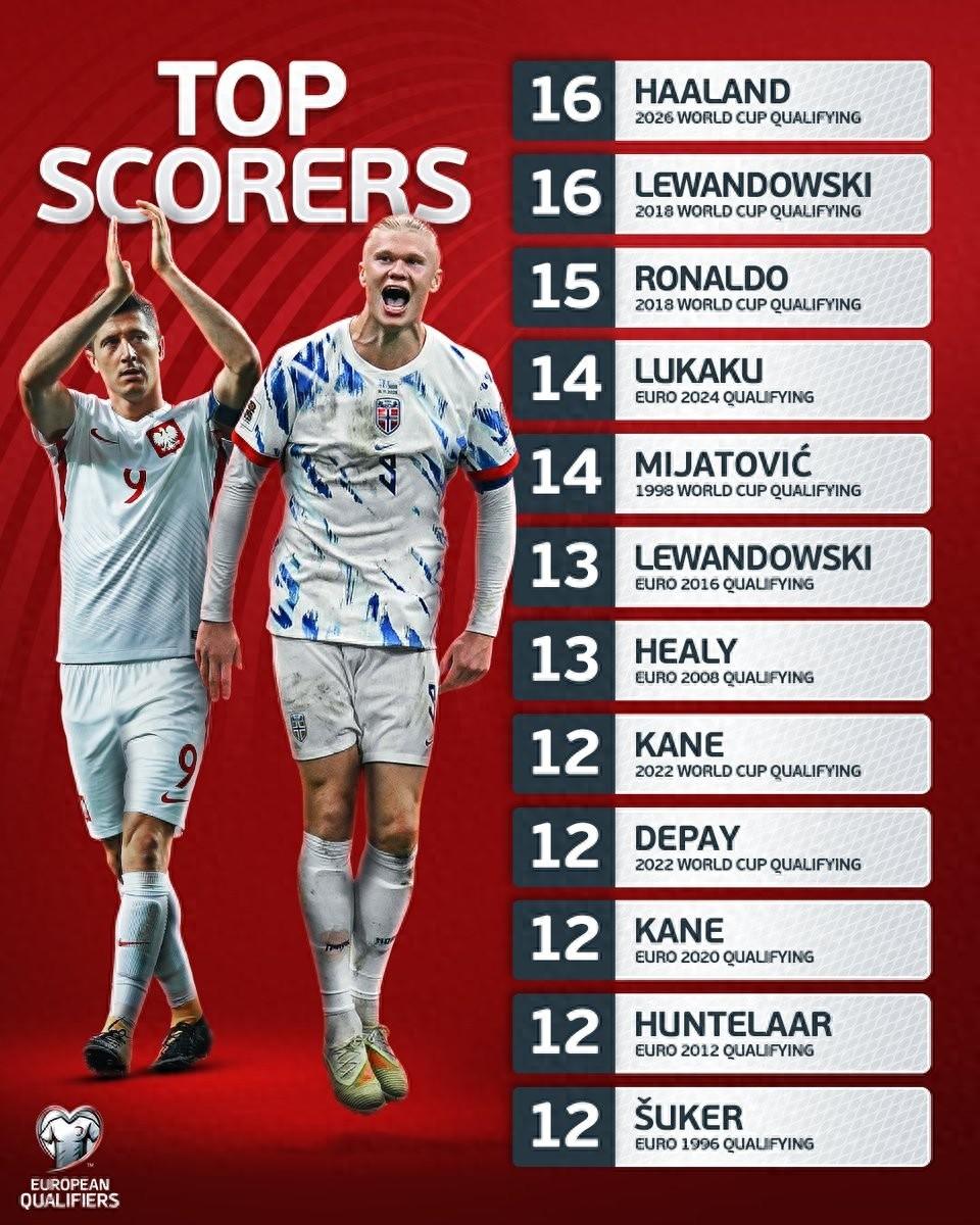 歐足聯官方列出了單屆歐洲區世預賽/歐洲盃預選賽進球榜,本屆世預賽的哈蘭德以16球與2018年世歐預的萊萬並列第一。