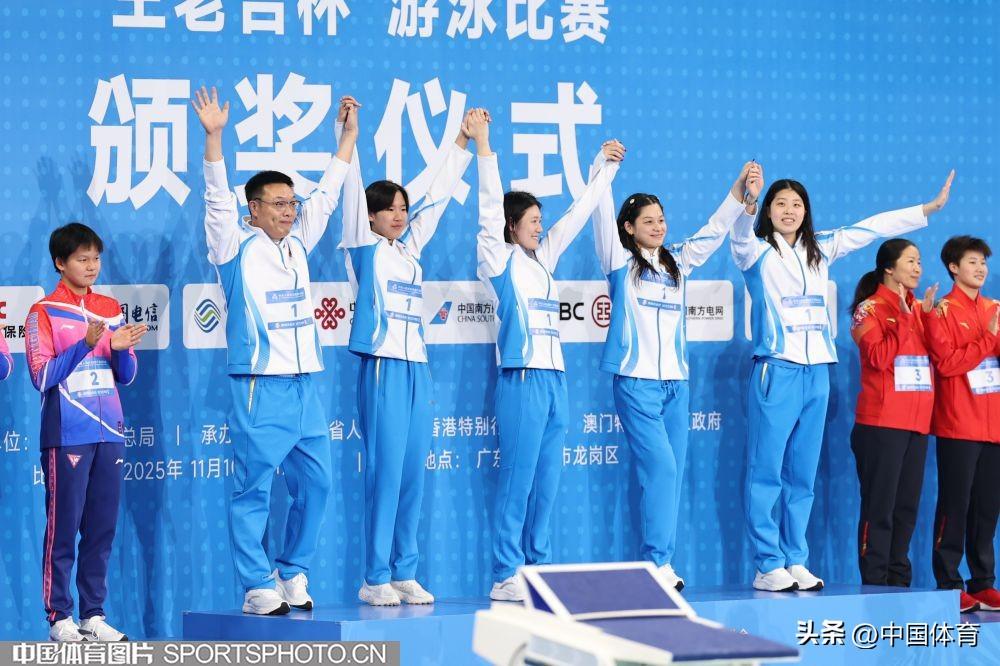 中國體育訊 11月17日晚,第十五屆全運會游泳比賽在深圳大運中心遊泳館落下帷幕。壓軸大戰女子4x100米混合泳接力決賽中,由魯星辰、餘依婷、葉詩文、吳卿風組成的浙江隊以3分57秒97的成績,獲得冠軍。上海隊和江蘇隊分獲亞軍和季軍。(中國體育圖片 安靈均 攝)