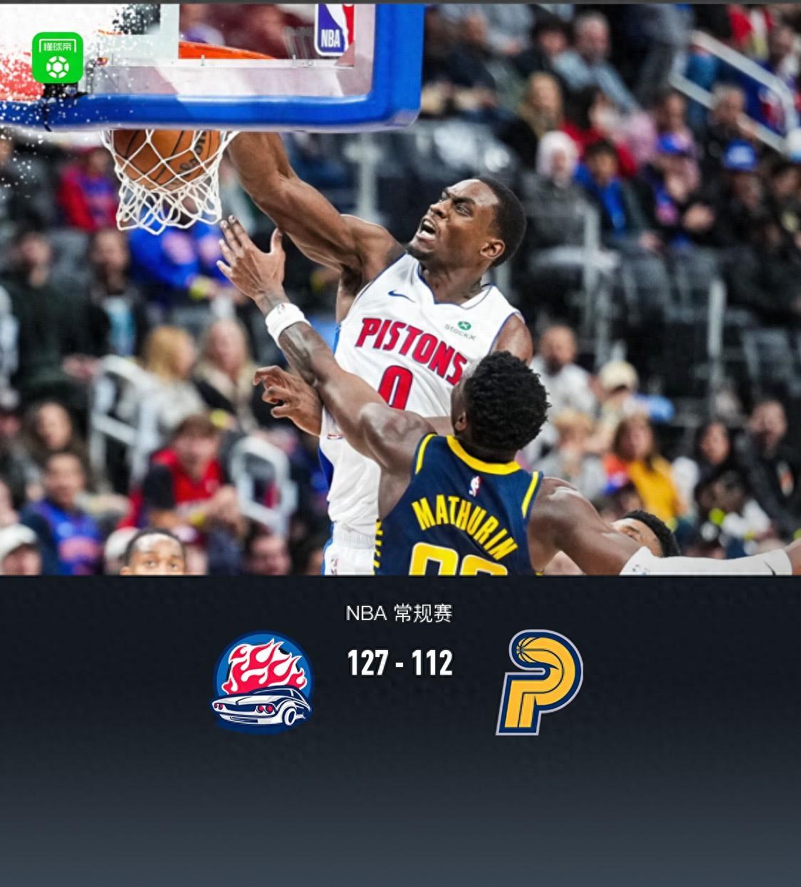 第四節活塞丹尼斯-詹金斯拿下13分,步行者馬圖林拿下14分,最終活塞127-112戰勝步行者