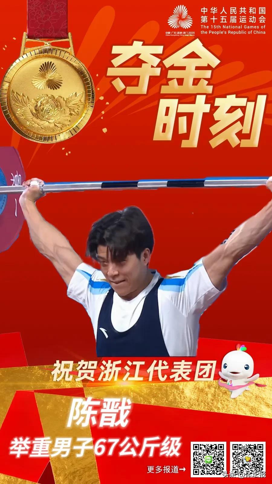 舉重賽場,石智勇帶着每日需5小時康復的傷病艱難前行,最終在男子73公斤級比賽中以抓舉161公斤、挺舉185公斤,總成績346公斤奪得金牌,續寫“不老傳奇”。台州小將陳戩在男子67公斤級比賽中爲浙江再添一金。