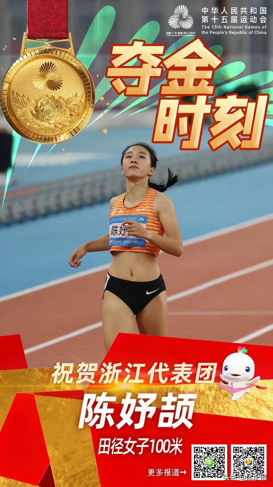 田徑賽場,中國百米冉冉升起的“紫微星”陳妤頡在百米女飛人的大戰中力壓一衆名將,以11秒10獲得金牌,成爲浙江田徑隊有史以來最年輕的全運會冠軍。