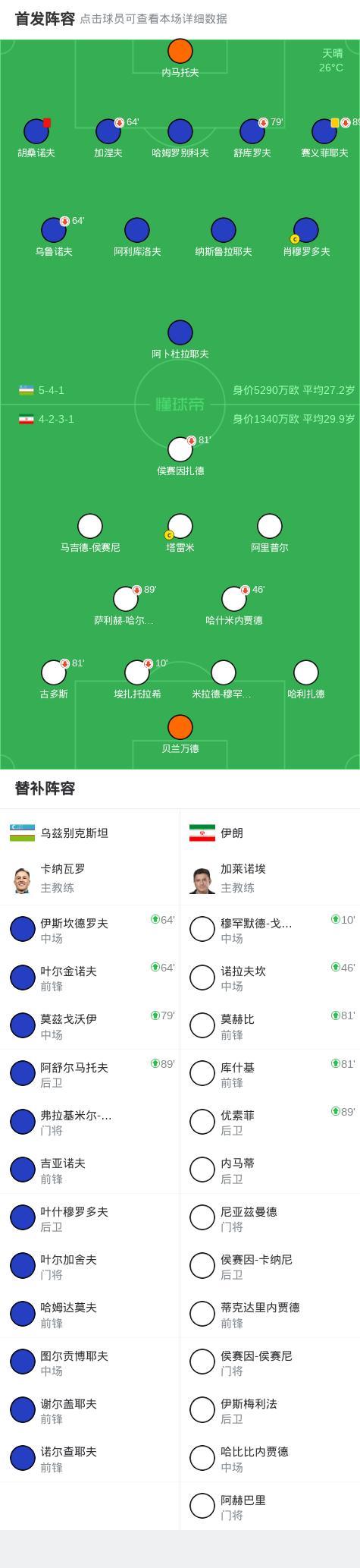 北京時間11月19日國際友誼賽,烏茲別克斯坦對陣伊朗。最終比分烏茲別克斯坦 4