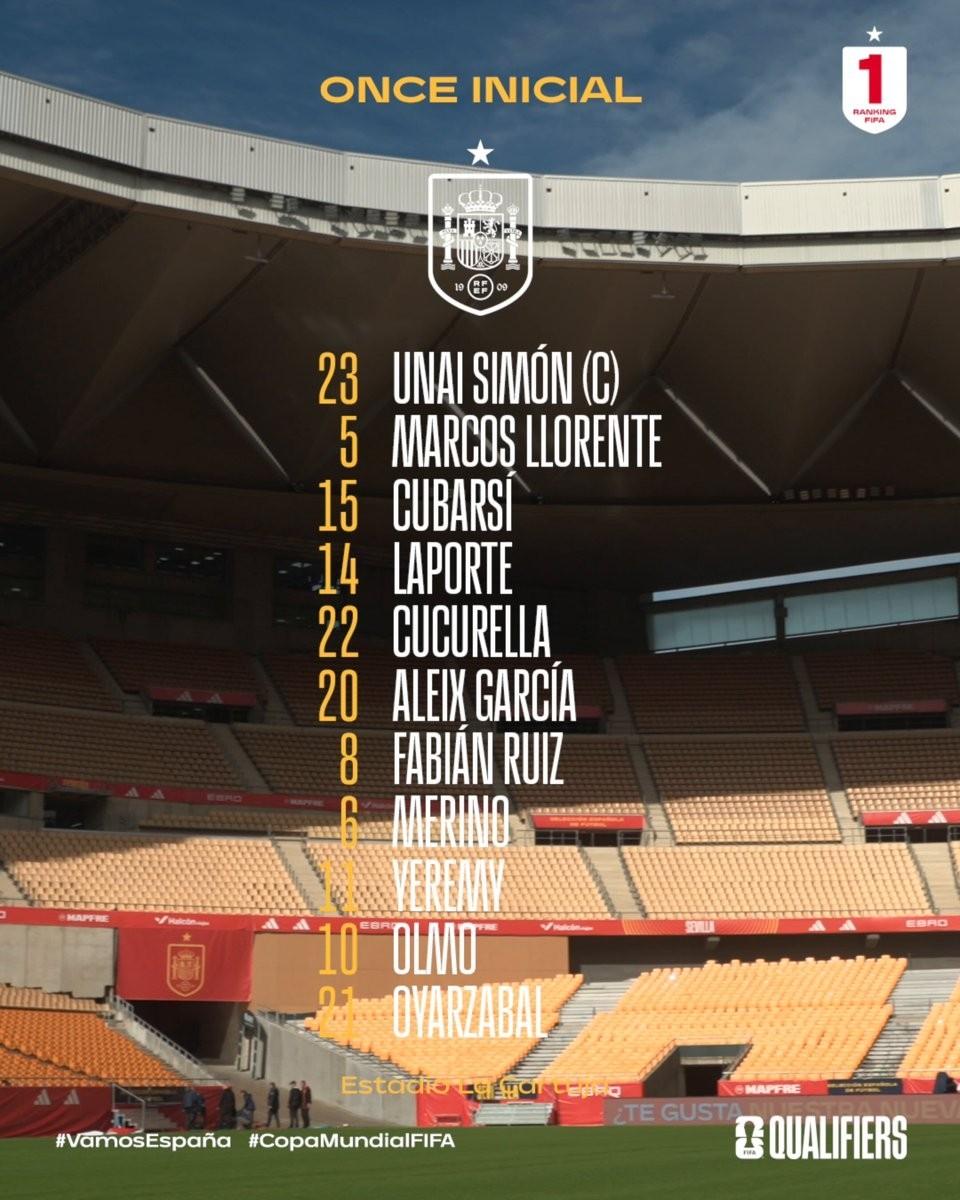 西班牙首發:23-烏奈-西蒙、5-馬科斯-略倫特、15-庫巴西、14-拉波爾特、22-庫庫雷利亞、6-梅里諾、20-阿萊士-加西亞、8-法比安-魯伊斯、11-耶雷米-皮諾、21-奧亞薩瓦爾、10-奧爾莫