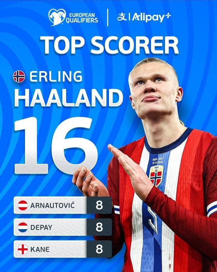 最終在本屆世預賽歐洲區的射手榜上,哈蘭德以16球位列第一,領先並列第二的阿瑙托維奇、哈里-凱恩以及德佩多達8球。