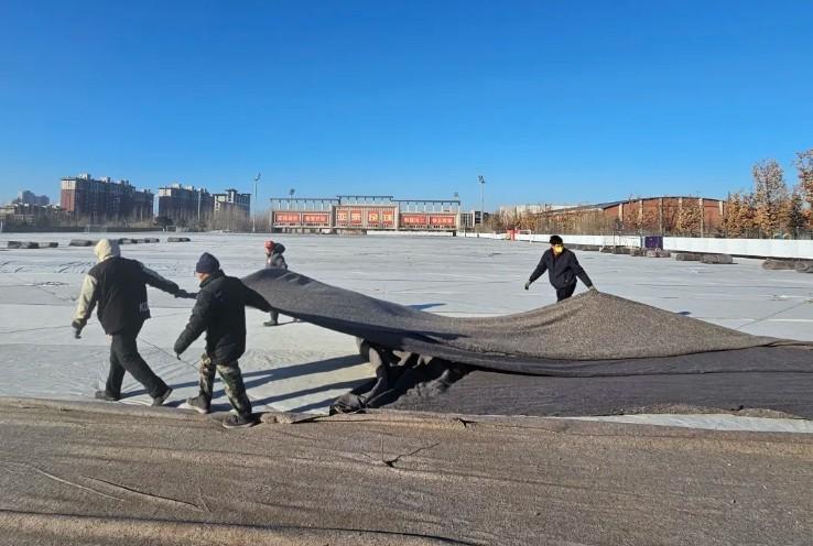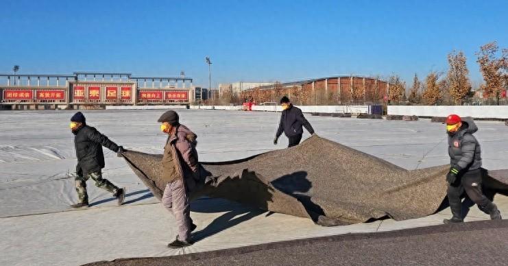 根據天氣預報顯示,長春下週將迎來大範圍降溫,基地草坪養護計劃爲天然草加蓋一層黑色“棉被”,確保草坪能夠得到保暖。