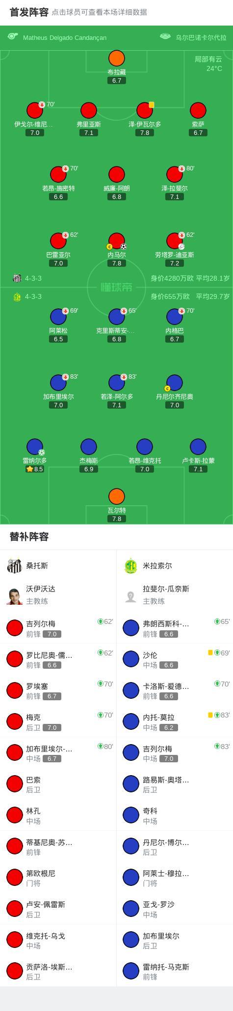 北京時間11月20日巴西足球甲級聯賽 聯賽 第34輪,桑托斯主場對陣米拉索爾。桑托斯內馬爾破門。米拉索爾雷納爾多破門。最終比分桑托斯 1-1 米拉索爾。