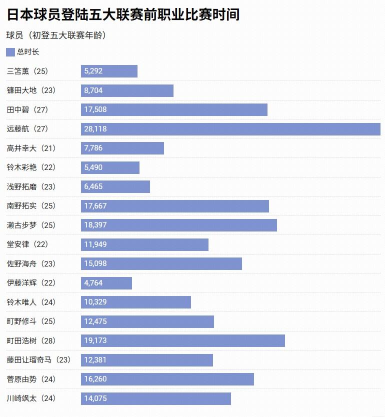 根據統計我們可以發現,從職業比賽出場時間的維度來看,除掉久保健英以及混血兒施密特這兩位歐洲青訓球員,剩下球員在登陸五大聯賽前出場時間的平均數是12885分鐘,按照每賽季38輪聯賽,每場比賽80分鐘的出場時間來估算,每個日本球員大約都需要至少4個賽季的歷練,才能夠從時間的角度滿足登陸五大聯賽的需求。