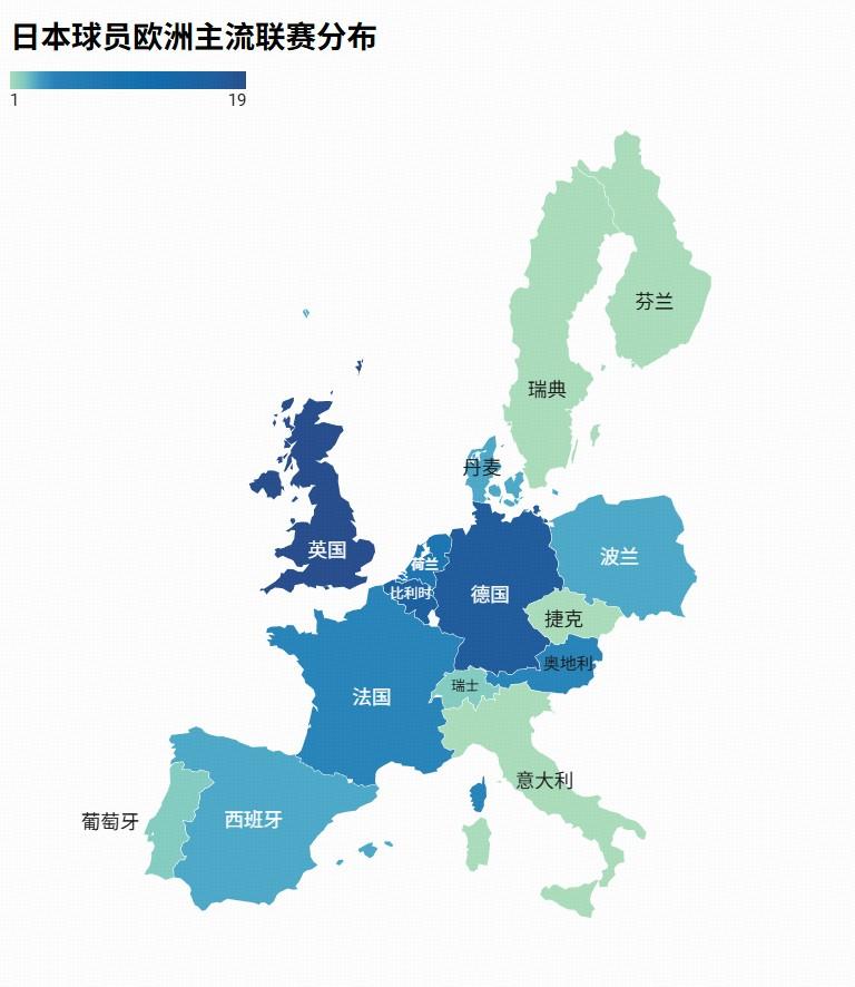 通過德國轉會市場數據取樣(涵蓋歐戰積分前二十國家頂級聯賽及五大聯賽次級聯賽),目前共有 85 名日本球員在這些賽場效力,位居亞足聯國家首位。其中五大聯賽 20 人、五大聯賽次級聯賽 20 人、其餘聯賽 45 人,比甲以 16 人成爲日本球員最集中的聯賽,英冠(10 人)、德甲(10 人)緊隨其後。若以球迷最爲看重的五大聯賽爲終極目標,日本球員的登陸路徑值得細細拆解。
