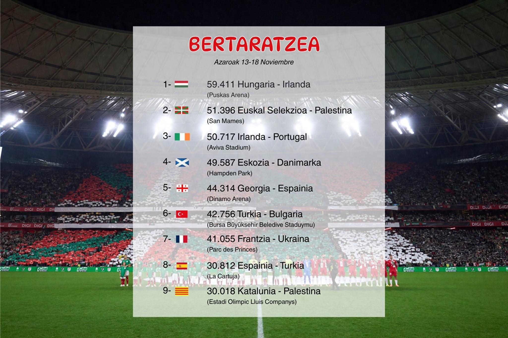 隨着本期國際比賽日結束,巴斯克足協統計了本期國際比賽日歐洲區上座人數超過3萬人的場次,其中巴斯克代表隊的比賽以51396人位列第二,而加泰羅尼亞代表隊以30018人位列第九。