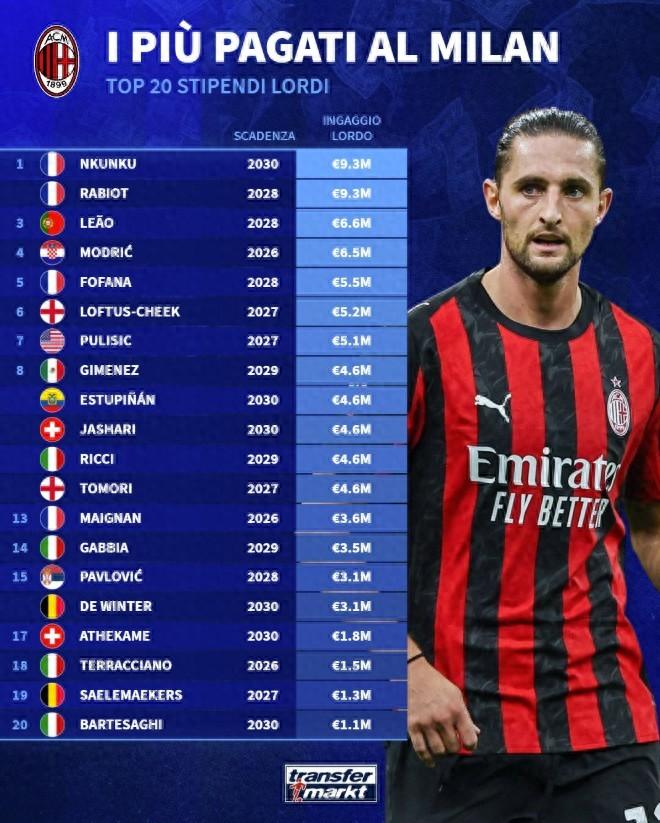 11月20日,德轉列出了本賽季米蘭球員的薪資排行,其中,兩個法國人恩昆庫和拉比奧以930萬歐的年薪排在了榜首,19歲小將巴爾泰薩吉以110萬歐排在末位。