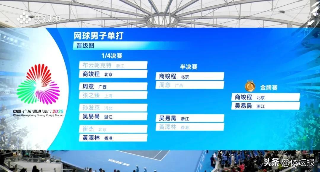 11月20日,第十五屆全運會網球單打項目進入決賽日,浙江選手吳易昺大戰三盤力克北京選手商竣程,爲浙江網球隊奪得歷史上首枚全運會金牌。