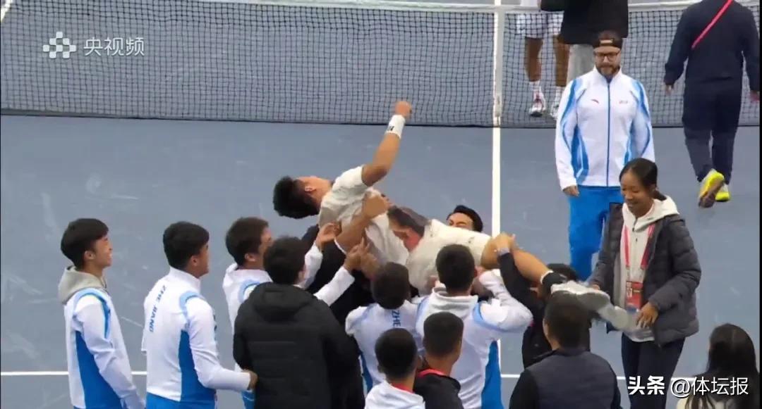 浙江網球隊的隊員和教練將吳易昺高高拋起慶祝