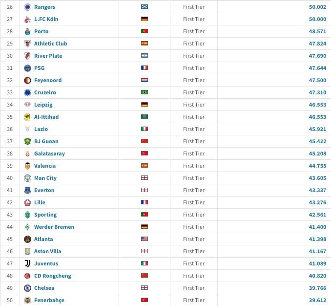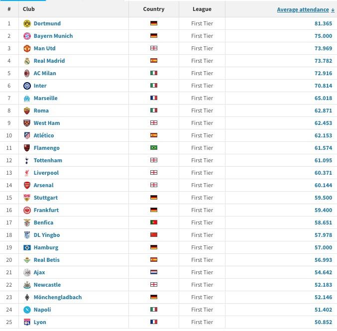 德轉本賽季全球主場場均上座TOP25:多特拜仁前二,英博第18