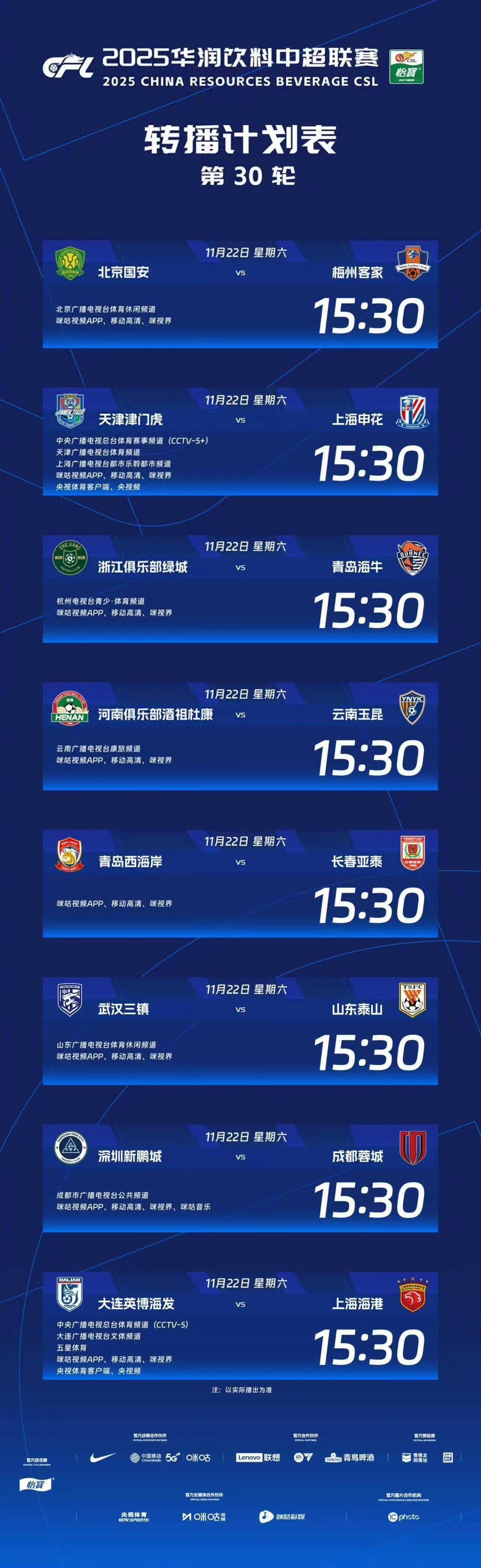 北京時間11月21日,中超官方發佈了聯賽第30輪的轉播計劃表,CCTV5轉播海港客戰英博,CCTV5+轉播申花客戰津門虎。