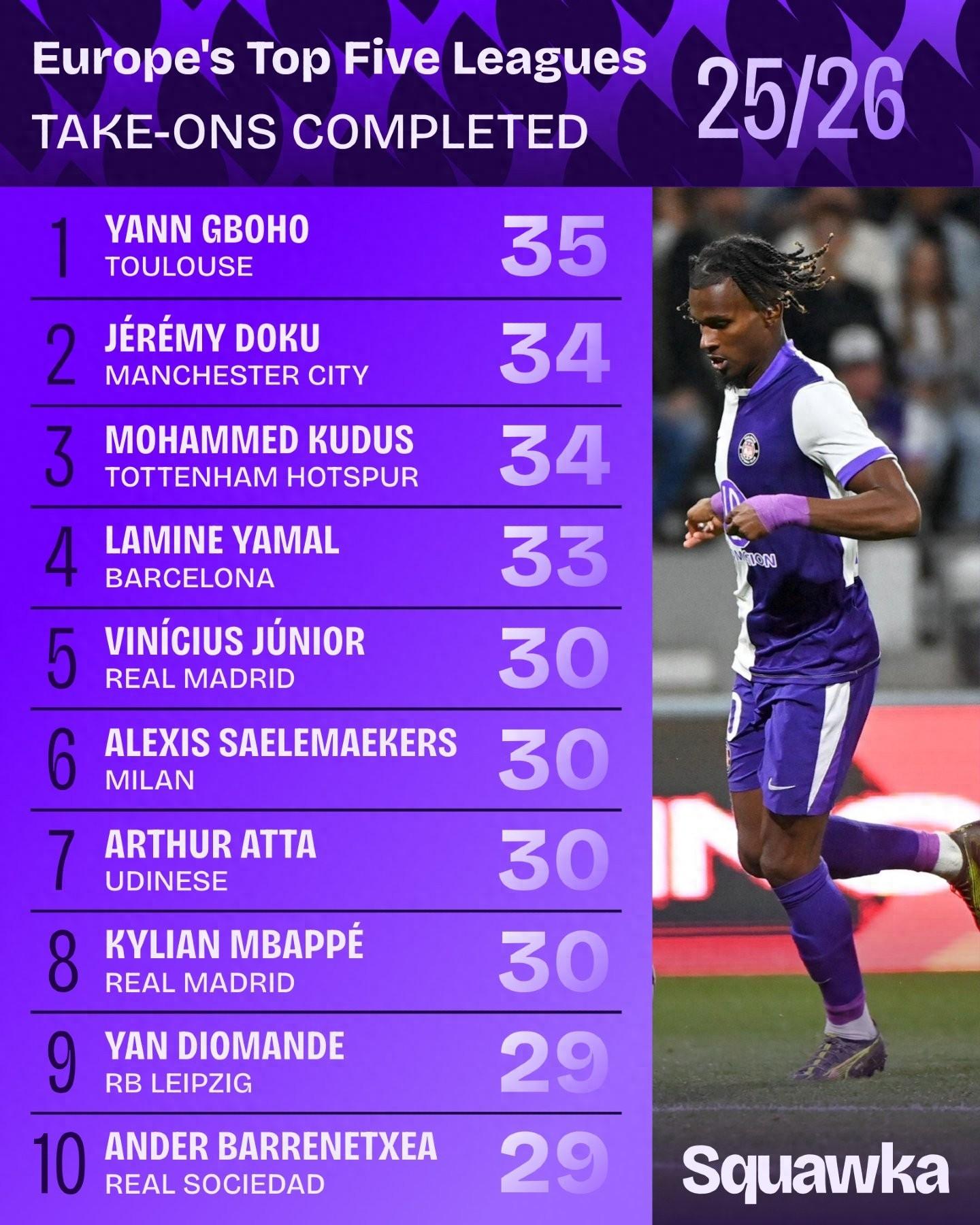 圖盧茲前鋒格博霍在本賽季12場法甲斬獲3球1助攻,據統計,他還完成35次過人,力壓多庫、庫杜斯等人,排在歐洲五大聯賽首位。