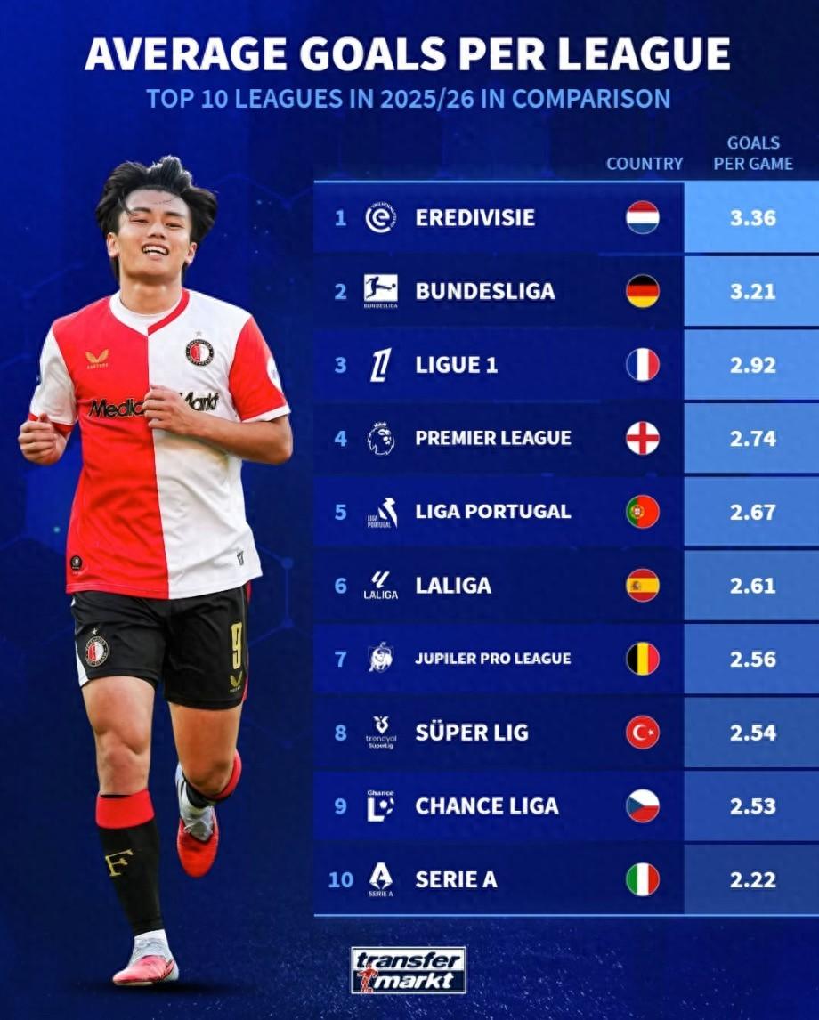 北京時間11月22日,德轉列出了本賽季至今歐洲前10聯賽的場均進球數排名,荷甲以場均3.36球高居第一,德甲3.21球領跑五大聯賽,英超2.74球第四,西甲2.61球第六,意甲2.22球墊底。