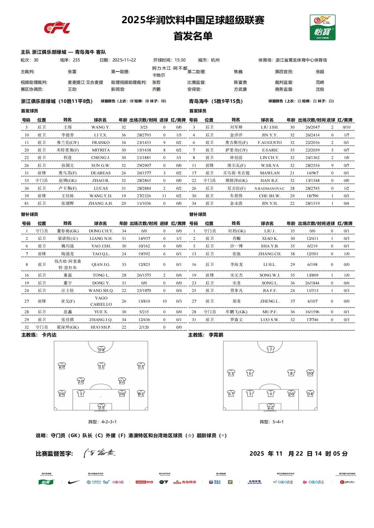 北京時間11月22日15:30,中超第30輪,浙江隊主場對陣青島海牛,本場比賽主裁判是張雷,VAR是麥麥提江,賽前雙方公佈首發: