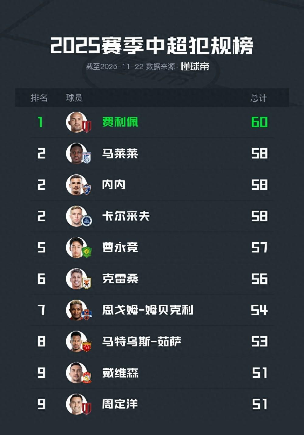 北京時間11月22日,中超聯賽第30輪比賽全部結束,本賽季中超聯賽犯規榜如下,其中費利佩60次犯規排名第一,馬萊萊、內內、卡爾採夫58次並列第二。