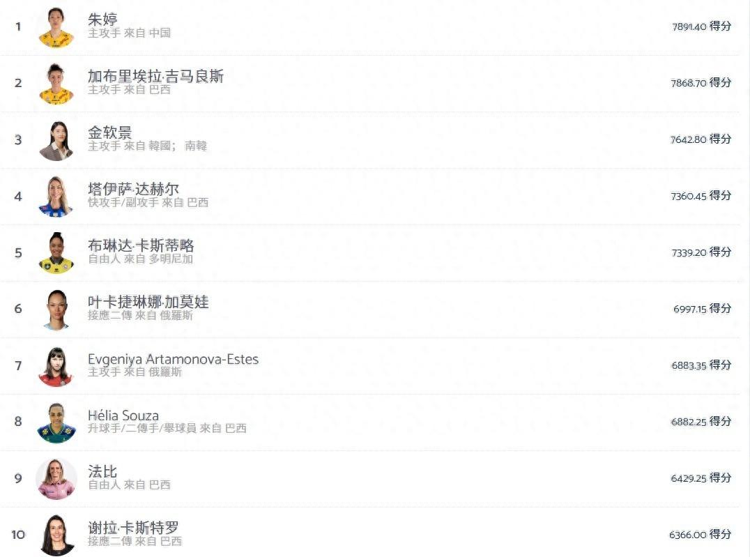 8 Hélia Souza 升球手/二傳手 巴西 6882.25