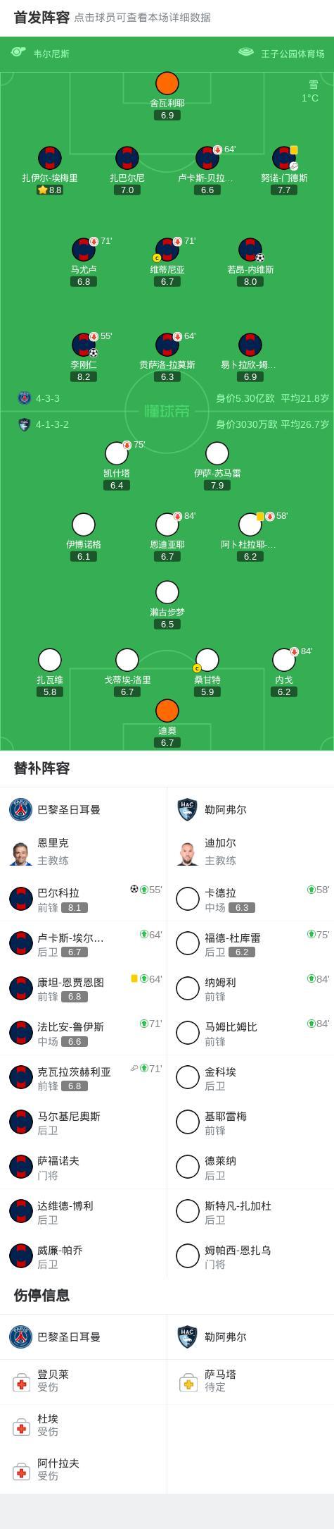 第67分鐘,巴爾科拉連續兩腳射門被擋出,內維斯補射建功,巴黎2-0