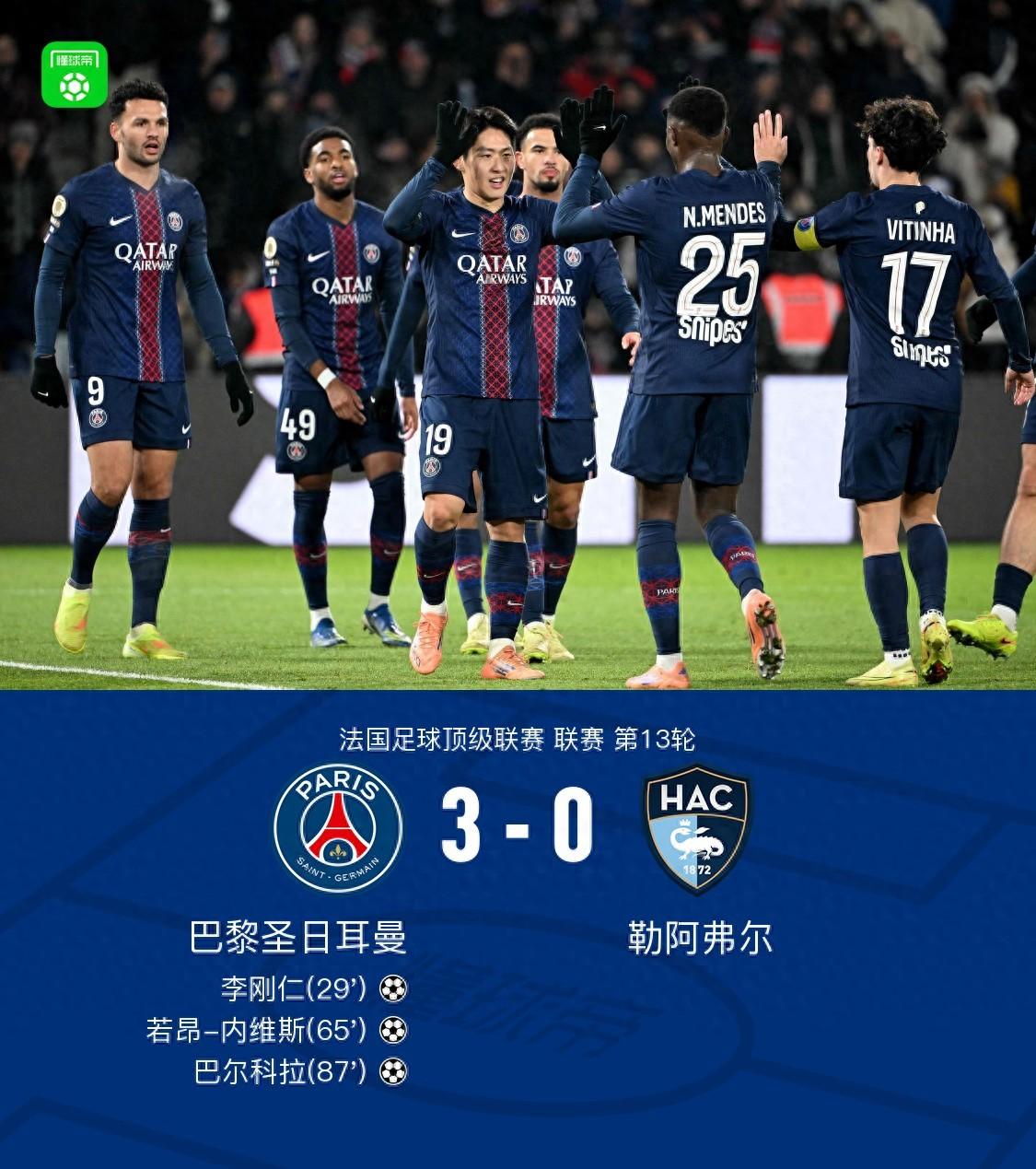 北京時間11月23日法國足球頂級聯賽 聯賽 第13輪,巴黎聖日耳曼主場對陣勒阿弗爾。上半場,門德斯助攻,李剛仁破門。下半場,巴爾科拉射門被擋出,內維斯補射建功。克瓦拉茨赫利亞直塞,巴爾科拉爆趟後破門。全場比賽結束,巴黎3-0輕取勒阿弗爾,以2分的優勢繼續領跑法甲。