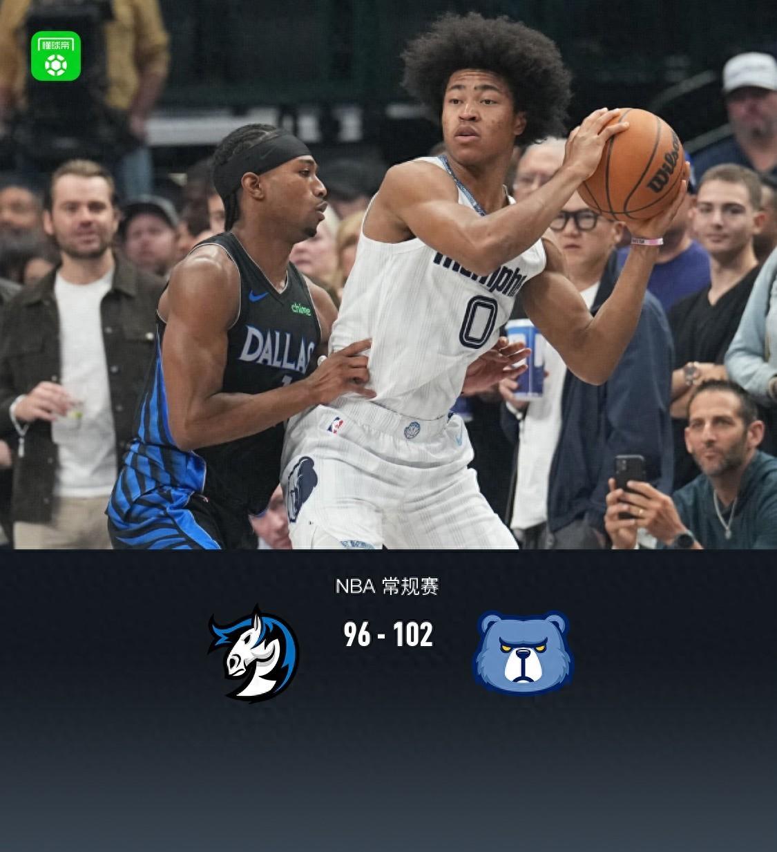 第四節獨行俠弗拉格拿下5分,灰熊凱姆-斯賓塞拿下8分,最終獨行俠96-102不敵灰熊