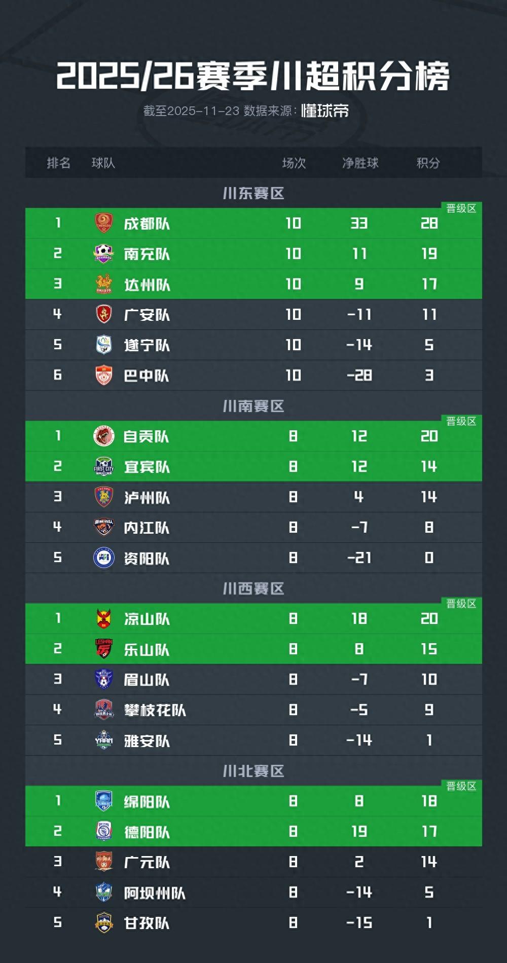 川東賽區的三支出線球隊在上輪就已經確定,成都、南充和達州排名小組前三,順利晉級。