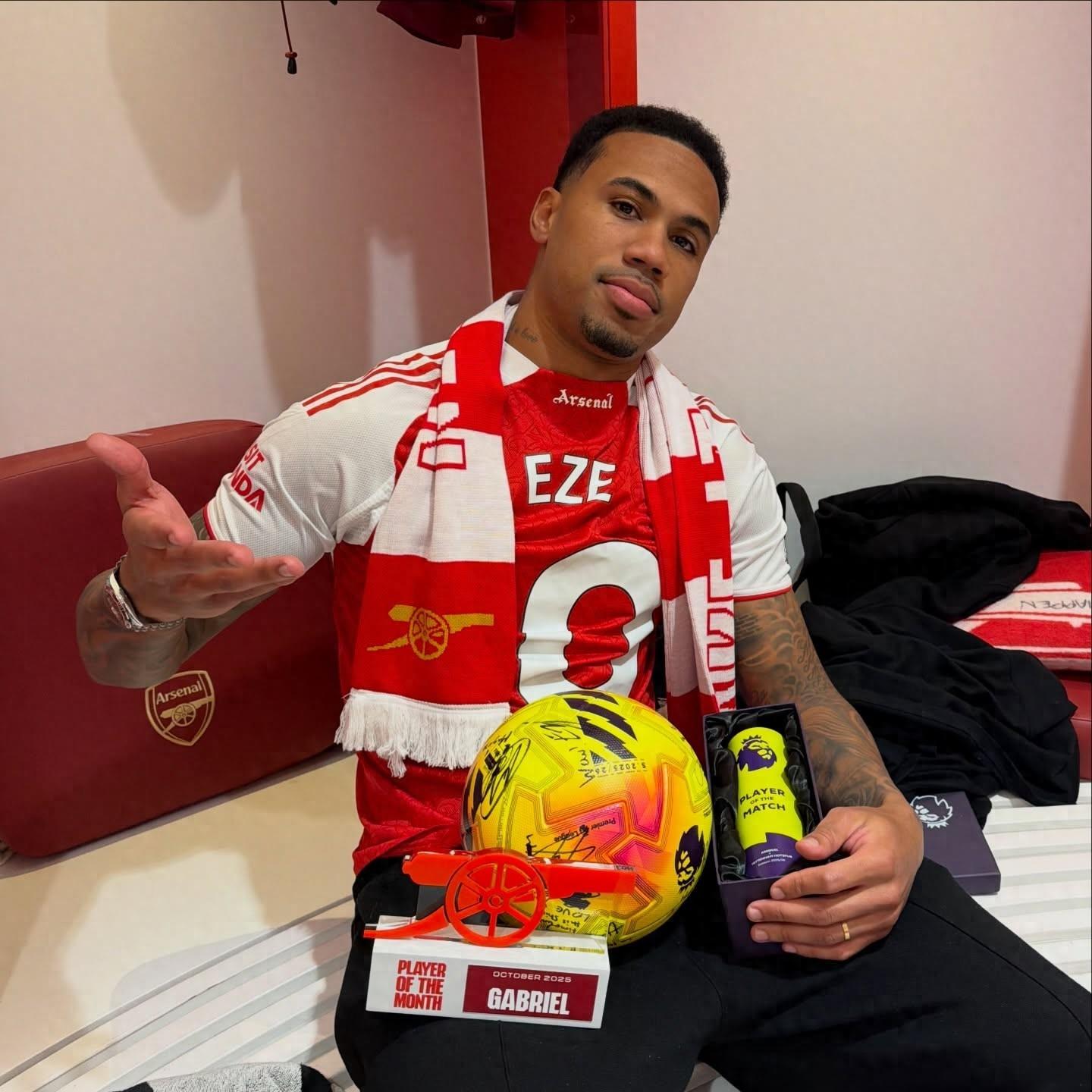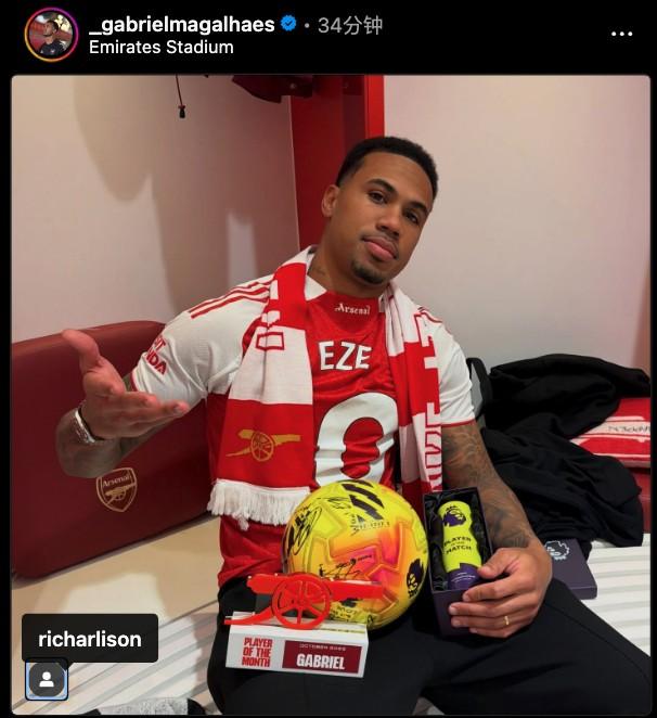 英超第12輪北倫敦德比,阿森納主場4-1大勝熱刺,因傷缺陣的槍手後衛加布裏埃爾賽後曬出他反穿埃澤球衣手拿全場最佳球員獎盃的照片,並標記了熱刺的巴西前鋒裏沙利松。
