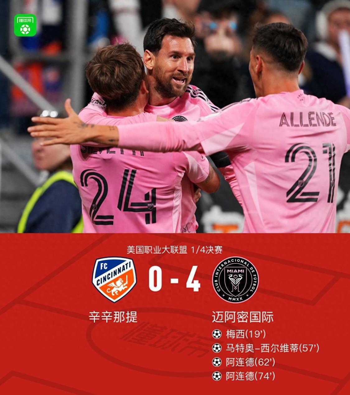邁阿密國際4-0辛辛那提晉級四強,梅西助攻戴帽+頭球破門,阿連德雙響