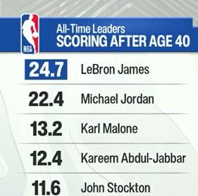 比賽期間,轉播方給出了一組關於詹姆斯的數據:在40歲之後,詹姆斯場均能拿到24.7分(不算本場比賽),這項數據排名NBA歷史第一。排在第二的是邁克爾-喬丹,他在40歲後場均能得到22.4分。第三名卡爾-馬龍則在得分上與前兩名存在檔次差距,他在40歲後只能得到13.2分。