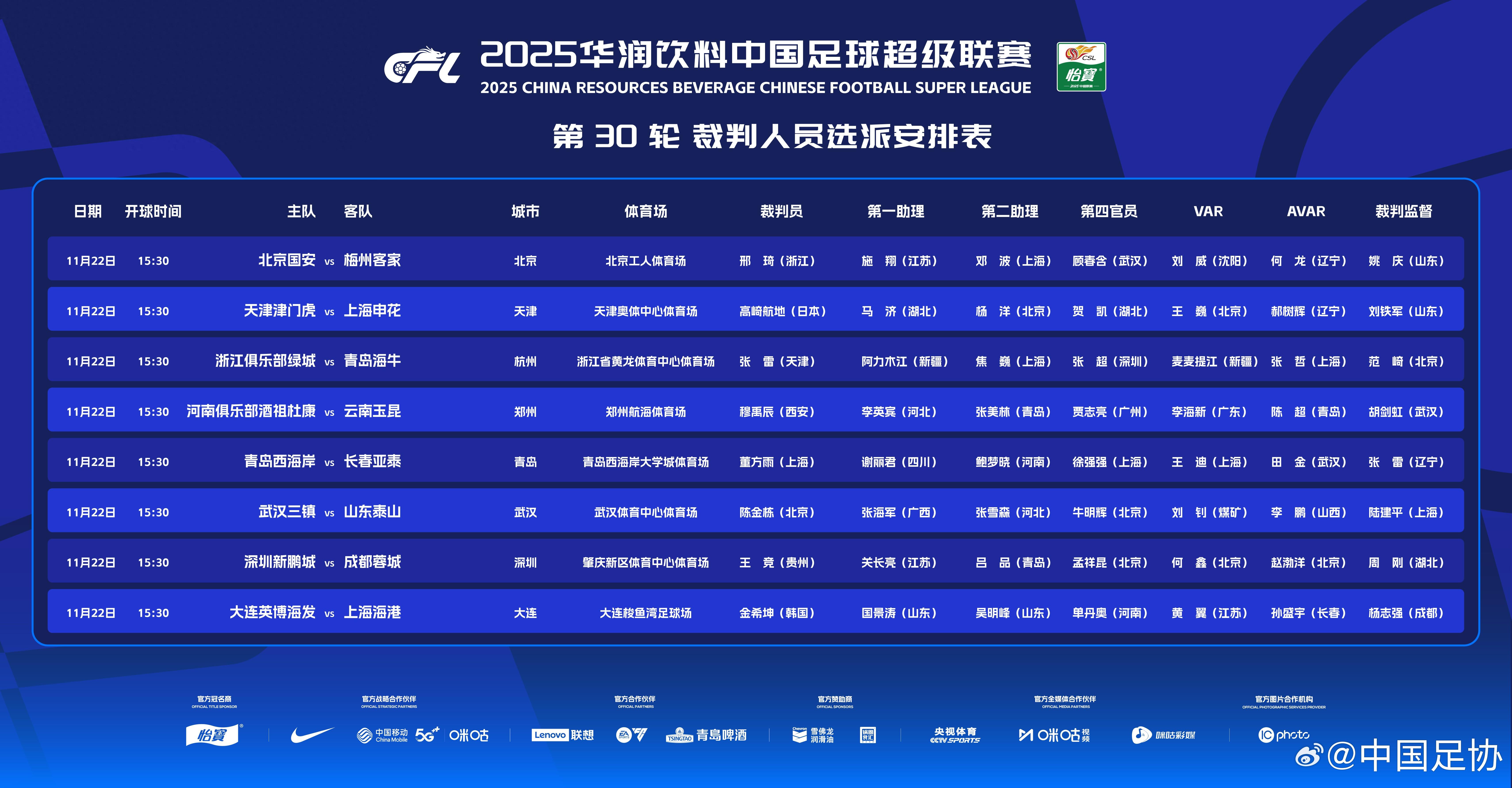 中超第30輪裁判選派