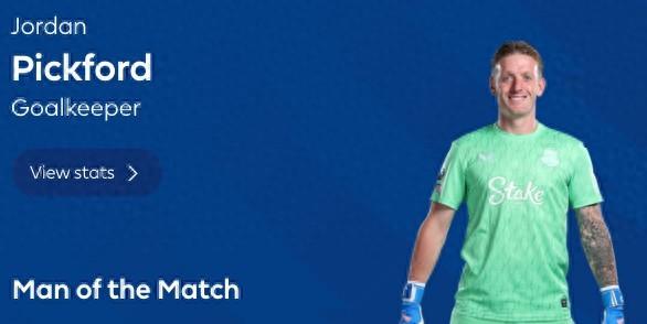 本場比賽埃弗頓門將皮克福德完成了6次撲救,力保球門不失。