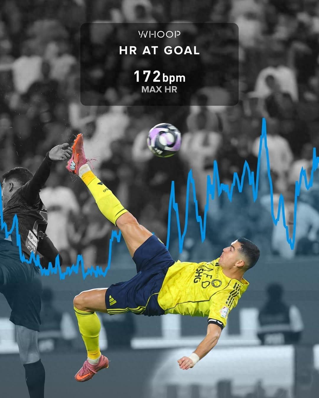 據製作可穿戴檢測設備的whoop公司消息,C羅在此前沙特聯賽中完成精彩倒鉤時的心率高達172bpm。