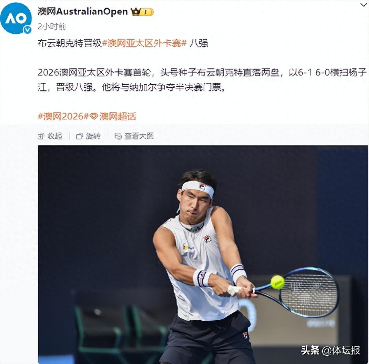 在今天進行的2026澳網亞太區外卡賽首輪,頭號種子布雲朝克特直落兩盤,以6-1、6-0橫掃楊子江,晉級八強。他將與納加爾爭奪半決賽門票。