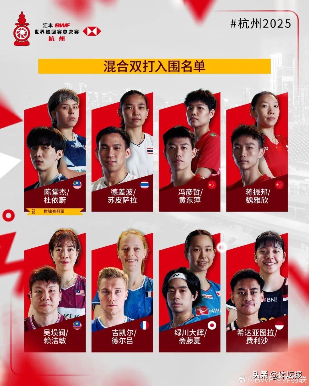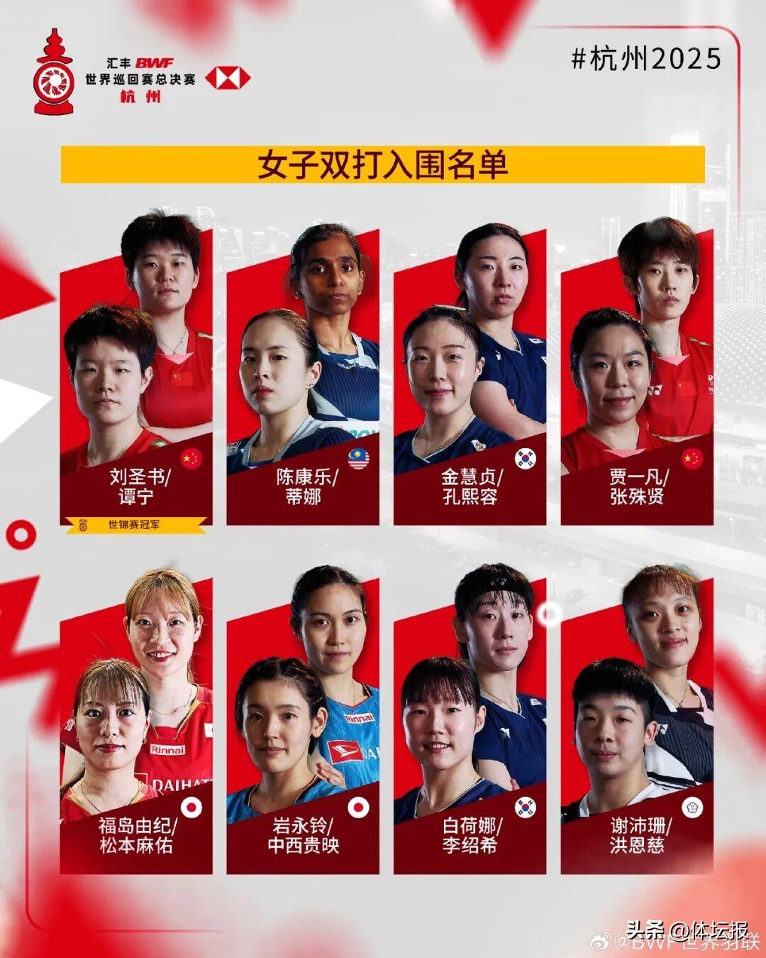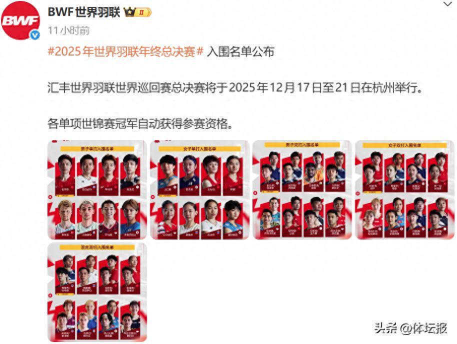 11月25日晚,BWF世界羽聯公佈2025年世界羽聯年終總決賽入圍名單。匯豐世界羽聯世界巡迴賽總決賽將於2025年12月17日至21日在杭州舉行,各單項世錦賽冠軍自動獲得參賽資格。